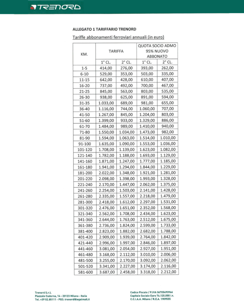 *Nel corso della presente Convenzione le tariffe possono subire variazioni per adeguamenti della tariffa e/o del prezzo di emissione tessera. Le eventuali variazioni dei prezzi saranno pubblicate sul sito www.trenord.it e comunicate tempestivamente da Trenord a Fondazione ADMO Lombardia ETS.