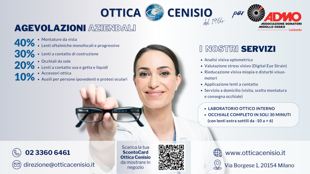 OTTICA CENISIO, centro di ottica storico in Milano con laboratorio interno e con servizi sanitari oftalmici anche a domicilio, è lieto di proporre ai Soci*, ai Donatori* ed ai dipendenti di Fondazione ADMO Lombardia ETS le seguenti agevolazioni: