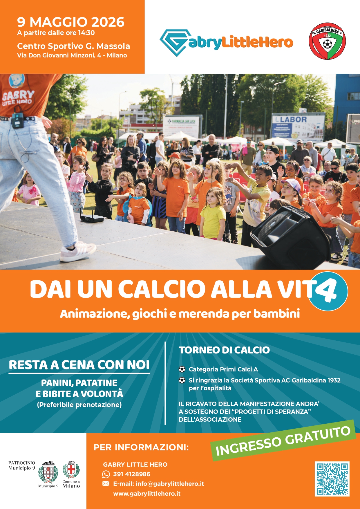 Vi aspettiamo sabato 9 maggio 2026 dalle 14:30 alle 18:30 c/o il Centro Sportivo G.Massola in Via Don Giovanni Minzoni, 4 a Milano sede della Garibaldina Calcio in cui ci saranno tantissime attività suddivise dedicate a bambini e famiglie suddivise per fascia d’età: area 0-3 anni, truccabimbi, spettacolo magia, baby dance, laboratori, sport integrato, etc.