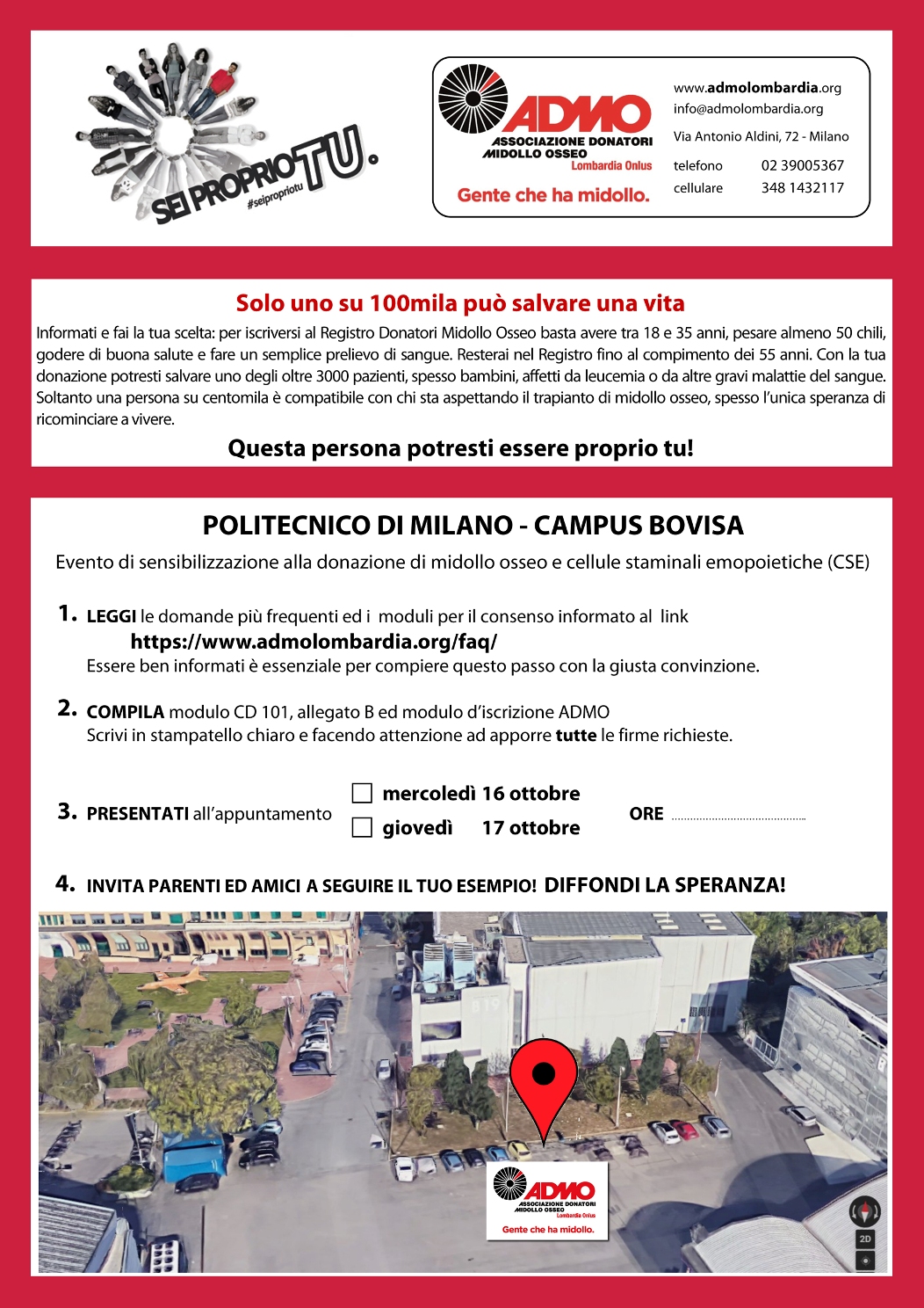 ADMO sarà presente in CAMPUS BOVISA zona Eliporto (Via La Masa) per dare la possibilità agli studenti di informarsi sulla donazione di midollo osseo (martedì 15 ottobre) e di iscriversi direttamente in loco al Registro dei Donatori (mercoledì 16 e giovedì 17 ottobre a partire dalle ore 9:30)